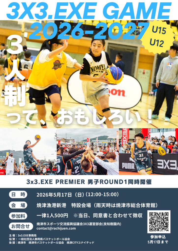 2026年5月17日(日) 、焼津漁港新港特設会場(雨天時は焼津市総合体育館)を会場に、3×3.EXE GAME 2026-2027を開催いたします。なお、申込はGoogleフォームにて行います。ご注意ください。