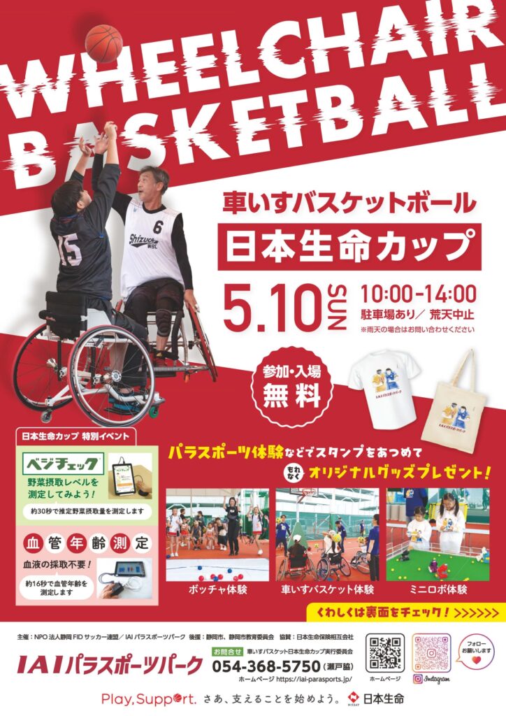 車いすバスケットボール「日本生命カップ」が令和8年5月10日(日)10時から14時まで静岡市清水区のIAIパラスポーツパークで開催されます。併せまして当日はパラスポーツ体験やキッチンカー来場などさまざまなイベントが催されます。